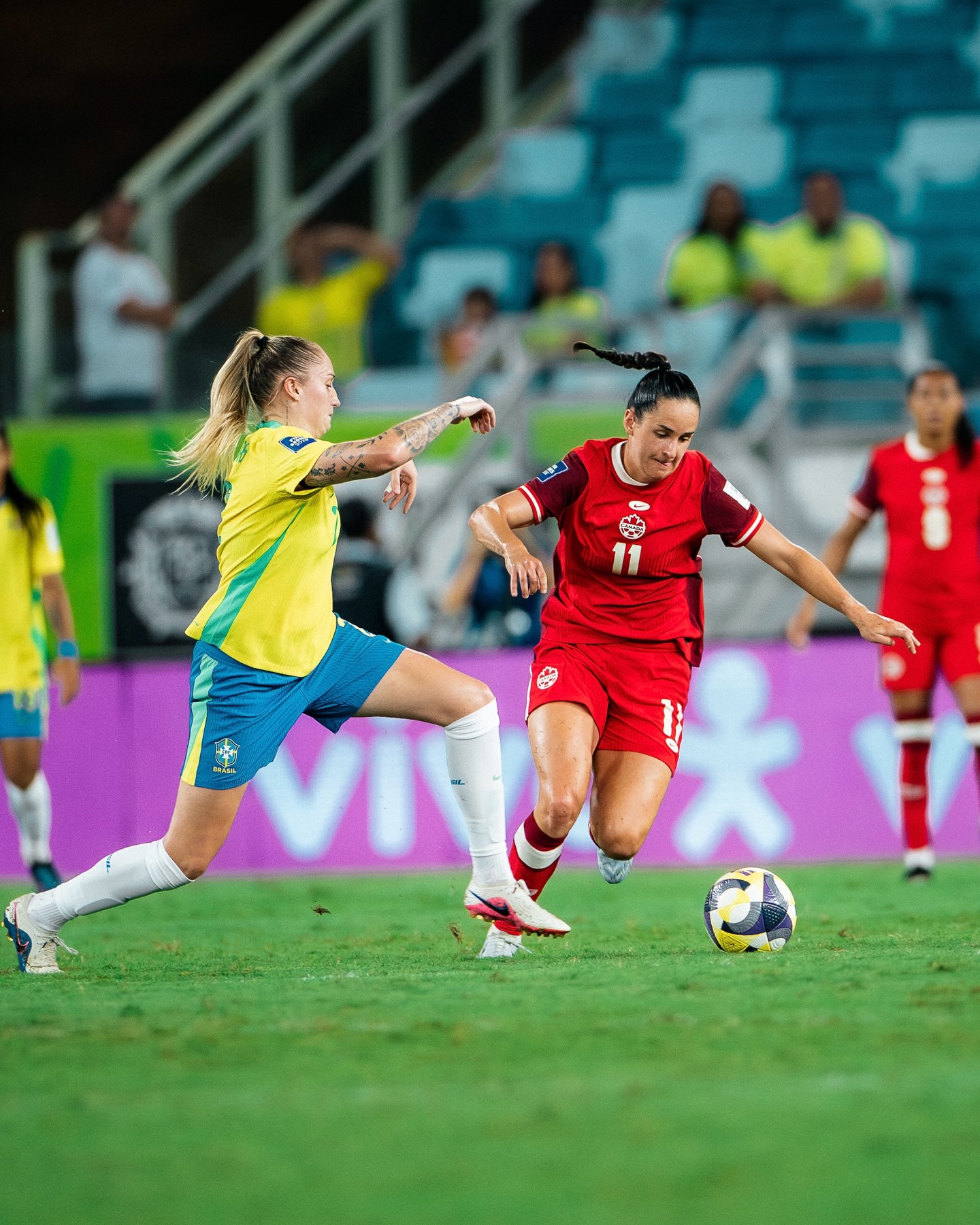 O Canadá até construía, mas sem levar perigo. A primeira aparição efetiva de Lelê, goleira brasileira, só aconteceu aos 40 minutos, quando precisou fechar o gol e evitar a finalização certeira de Olivia Smith, que desceu em velocidade e chutou cruzado.